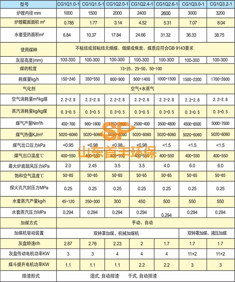 單段式煤氣發(fā)生爐冷煤氣站(無煙煤)工藝流程:由山東煤氣發(fā)生爐生成的粗熱煤氣,溫度為500-600℃,進入雙豎管經循環(huán)水冷卻,將煤氣中的部分灰塵洗滌下來,從豎管下部的水封中排出,煤氣從豎管中出口,溫度約為80-90℃,進入洗滌塔進行冷卻和除塵,使煤氣溫度冷卻至35-45℃,再進入電氣濾清器進行除塵和捕出煤氣中焦油后,經煤氣加壓機加壓,捕滴器進一步脫去煤氣中的水分后,送往各用戶使用。 單段式煤氣發(fā)生爐技術性能參數(shù):